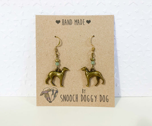 ANTIQUE BRASS BRONZE GOLD ITALIAN GREYHOUND WHIPPET SIGHTHOUND LURCHER EARRINGS NATURAL JADE GEMSTONE CHARM LOVE HEART KEEPSAKE GIFT