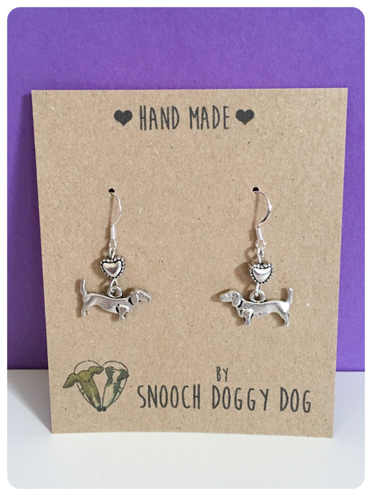ANTIQUE SILVER DACHSHUND SAUSAGE DOG EARRINGS CHARM LOVE HEART KEEPSAKE GIFT
