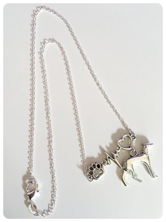 SILVER GREYHOUND WHIPPET SIGHTHOUND LURCHER CHARM NECKLACE CHAIN HEARTBEAT PAW PRINT HEART KEEPSAKE GIFT