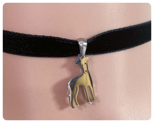 SILVER GREYHOUND WHIPPET SIGHTHOUND LURCHER STAINLESS STEEL CHARM BLACK VELVET CHOKER NECKLACE KEEPSAKE GIFT