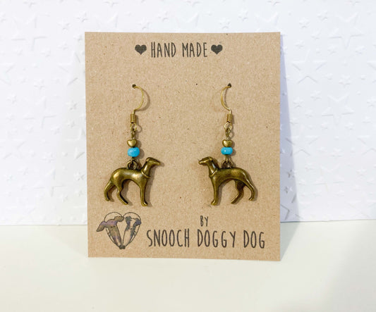 ANTIQUE BRASS BRONZE GOLD ITALIAN GREYHOUND WHIPPET SIGHTHOUND LURCHER EARRINGS NATURAL TURQUOISE GEMSTONE CHARM LOVE HEART KEEPSAKE GIFT