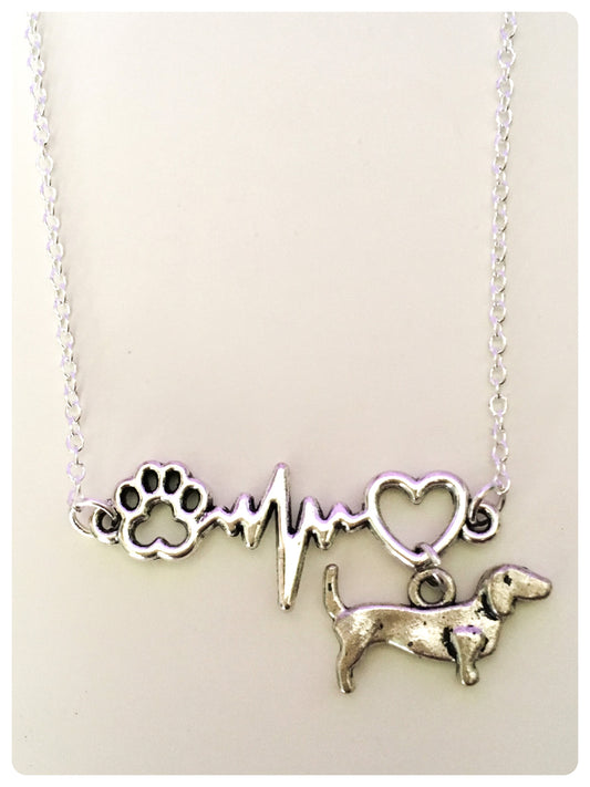 ANTIQUE SILVER DACHSHUND SAUSAGE DOG CHARM NECKLACE HEARTBEAT LOVE HEART KEEPSAKE GIFT