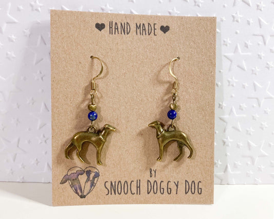 ANTIQUE BRASS BRONZE GOLD ITALIAN GREYHOUND WHIPPET SIGHTHOUND LURCHER EARRINGS NATURAL LAPIS LAZULI BLUE GEMSTONE CHARM LOVE HEART KEEPSAKE GIFT