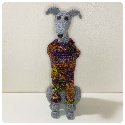 GREY BLUE CROCHET MINI WHIPPET GREYHOUND SIGHTHOUND ITALIAN GREYHOUND PLUSH IN A KNITTED MULTI FLECK WOOL HOODIE KEEPSAKE MEMORIAL GIFT
