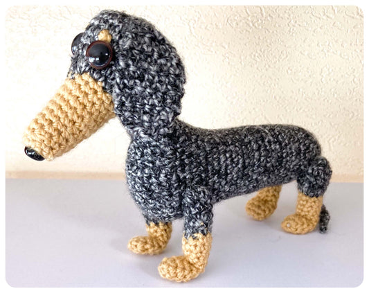 SILVER DAPPLE TAN CROCHET MINI DACHSHUND SAUSAGE DOG WEENIE DOXIE WIENER PLUSH KEEPSAKE MEMORIAL GIFT