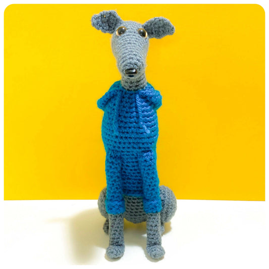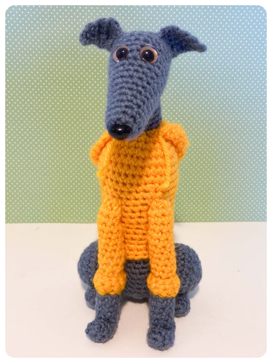 GREY BLUE CROCHET MINI WHIPPET GREYHOUND SIGHTHOUND ITALIAN GREYHOUND PLUSH IN A KNITTED YELLOW HOODIE KEEPSAKE MEMORIAL GIFT