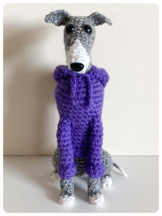 GREY BLUE BRINDLE WHITE CROCHET MINI WHIPPET GREYHOUND SIGHTHOUND ITALIAN GREYHOUND PLUSH IN A KNITTED PURPLE HOODIE KEEPSAKE MEMORIAL GIFT