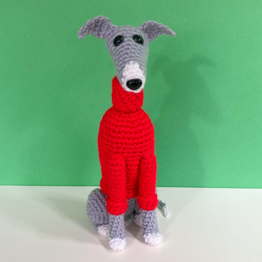 BLUE GREY WHITE CROCHET MINI WHIPPET GREYHOUND SIGHTHOUND ITALIAN GREYHOUND PLUSH IN A KNITTED RED SWEATER KEEPSAKE MEMORIAL GIFT
