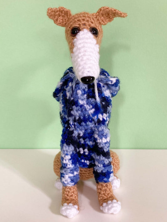 TAN WHITE CROCHET MINI WHIPPET GREYHOUND SIGHTHOUND ITALIAN GREYHOUND PLUSH IN A KNITTED BLUE HOODIE KEEPSAKE MEMORIAL GIFT