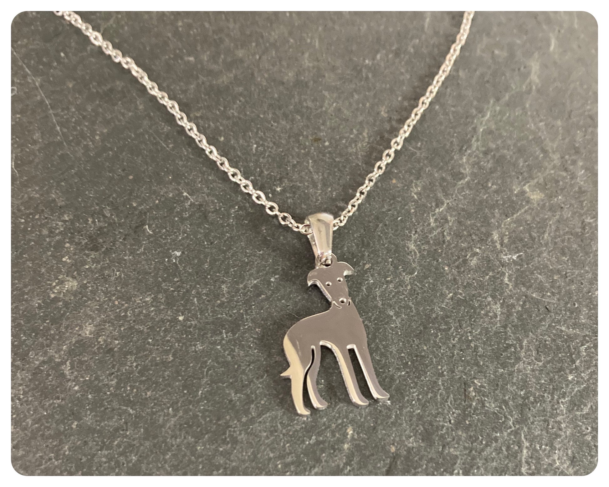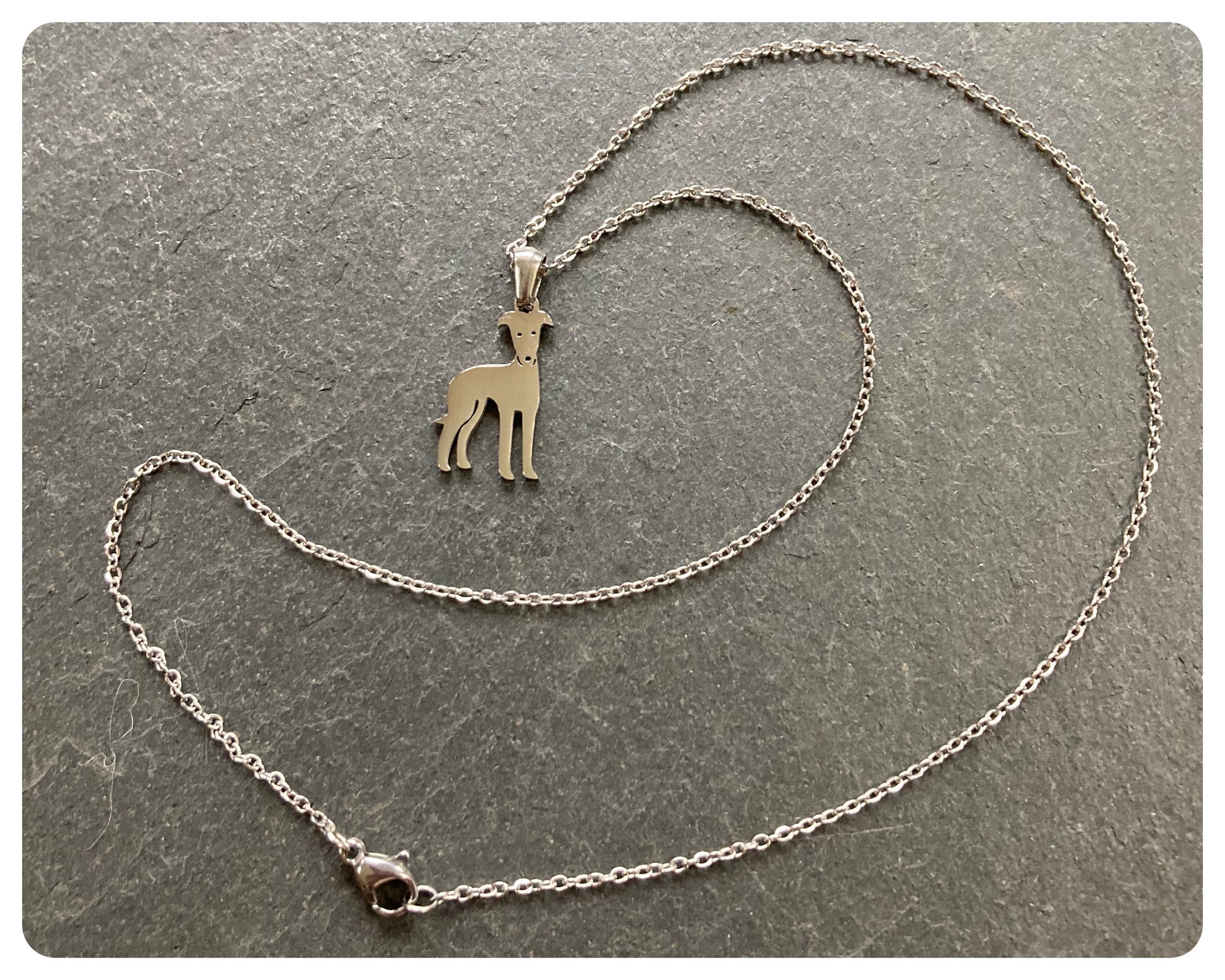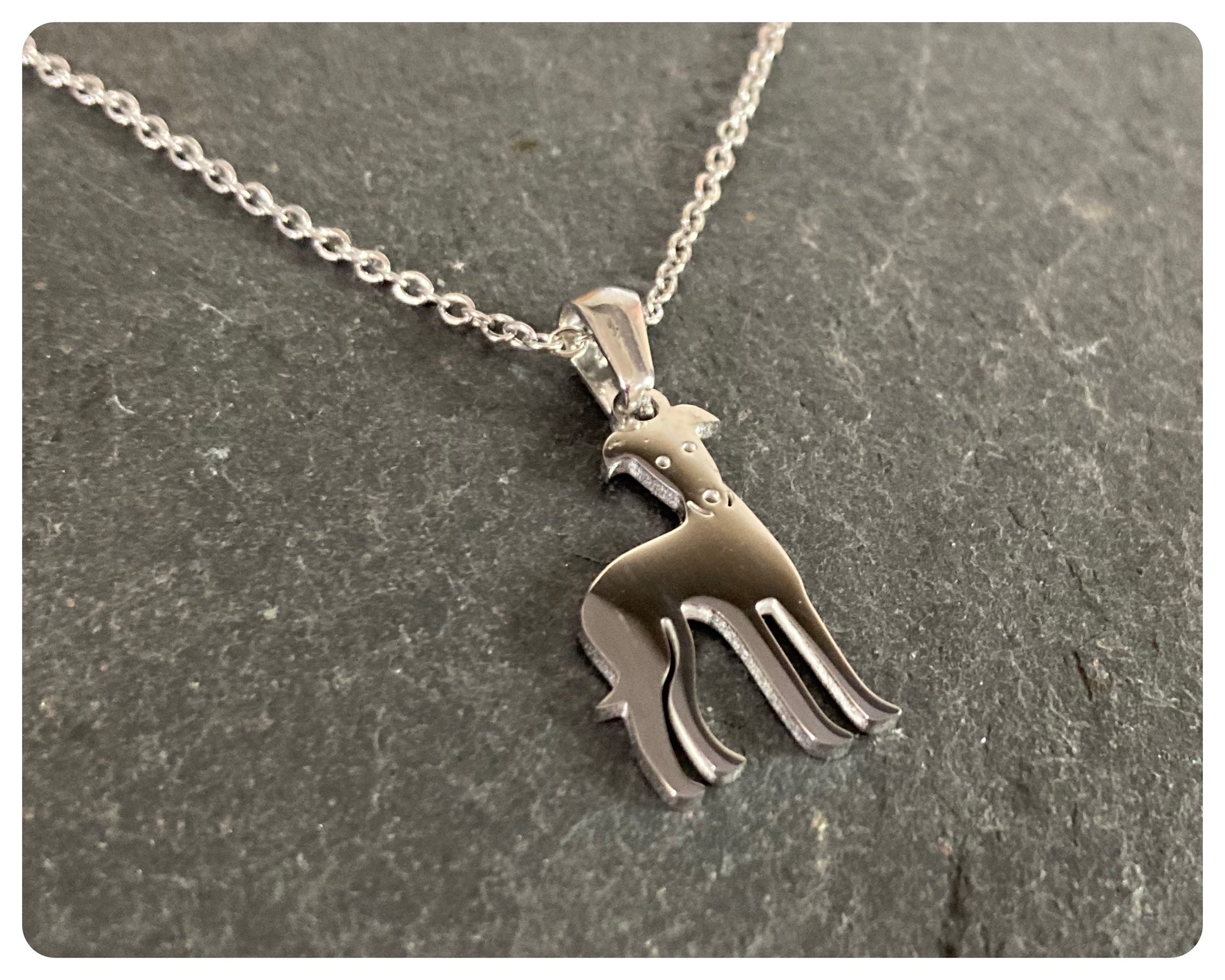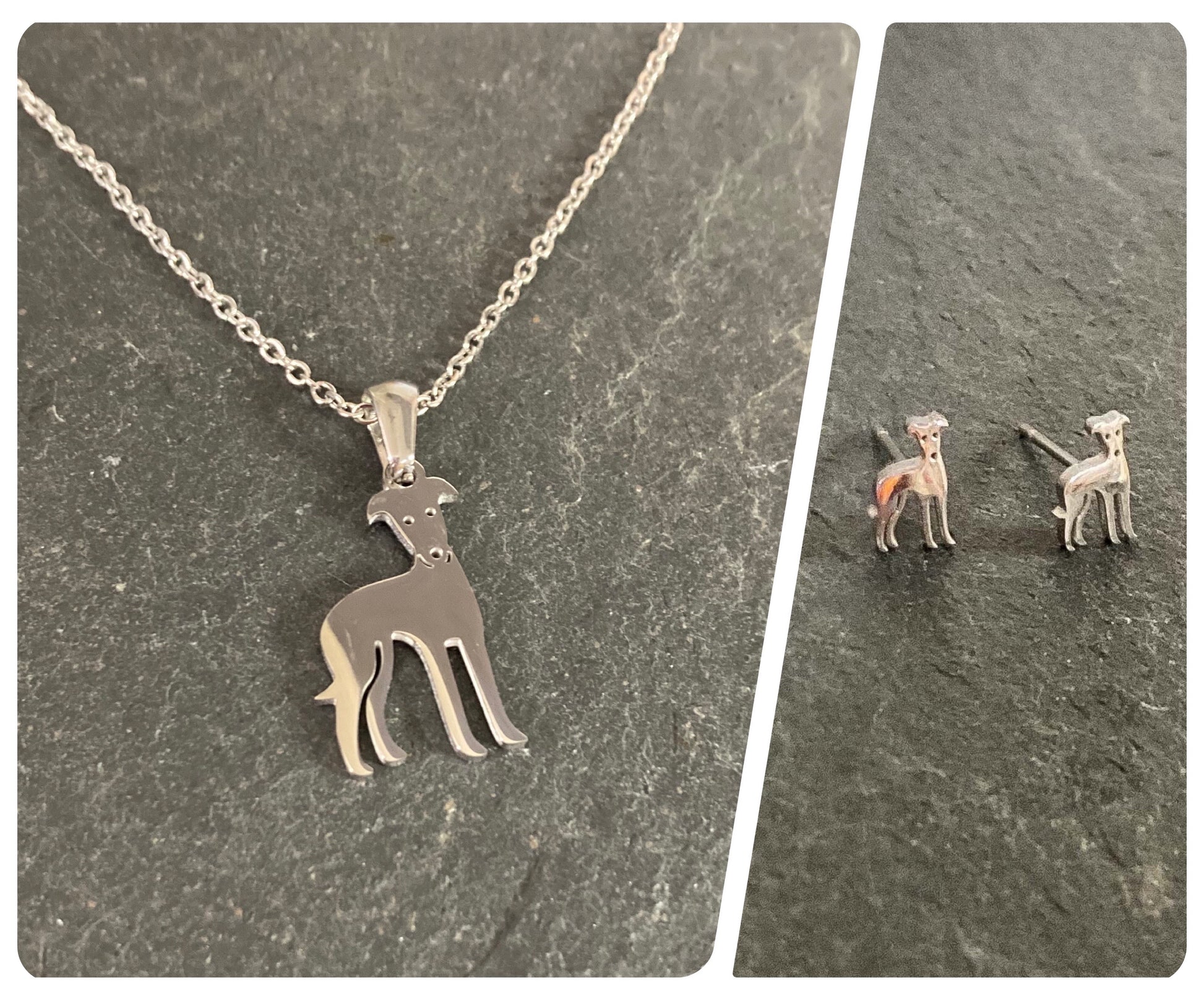 Super cute sighthound pendant necklace & tiny matching stud earrings made from quality shiny stainless steel with gorgeous tooled detailing, the necklace pendant is suspended on a matching fine stainless steel chain.
